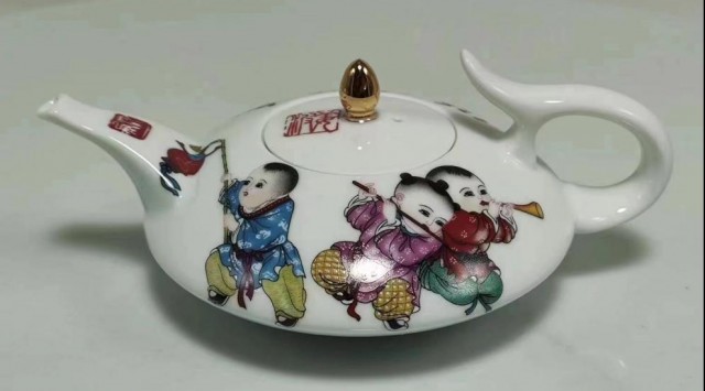 婴戏图是以儿童游戏为装饰题材的纹样,是瓷器人物装饰中的典型纹样之一。所谓的婴戏,即以孩童为画面的主角,描写儿童钓鱼、玩鸟、蹴球、赶鸭、放鹌鹑、抽陀螺、攀树折花等种种活动,着墨不多而情趣盎然。婴戏题材最早出自汉画像石《母子图》,而后将婴戏在丝绸、绘画、雕刻上逐步发展。古代婴戏图,作为祈求后代子孙昌盛的图饰被人所追捧。而姜波教授运用现代的手法,将婴戏题材大量运用到瓷器装饰上,对孩童最纯真朴实、无私无邪的嬉戏场景进行生动描绘,不仅表达了人们祈求富贵满堂、喜庆吉祥的美好意愿,又蕴含了企盼“童心”返璞归真,天性纯真的美好愿望。