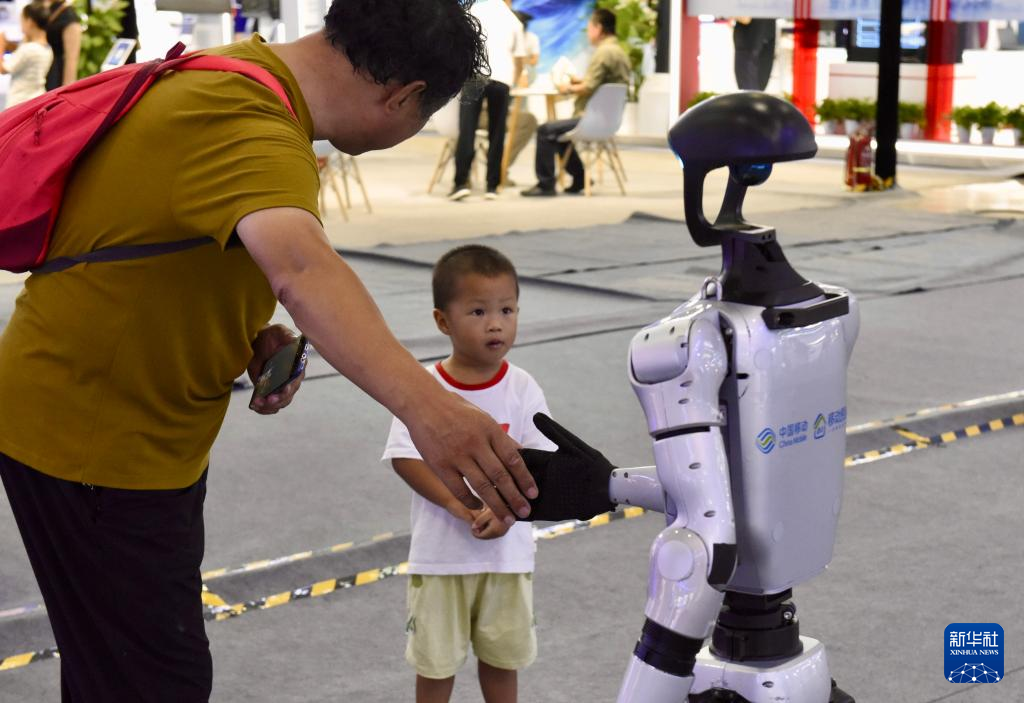 9月7日,观众与中国移动灵犀机器人互动。