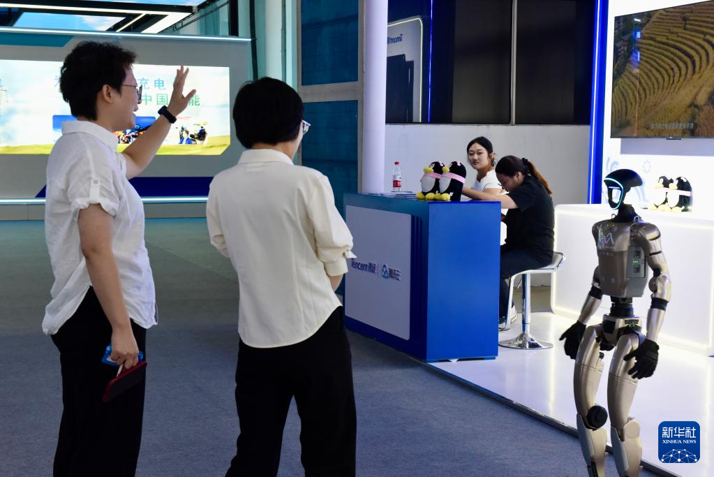 9月7日,观众在展览区与宇树G1机器人互动。