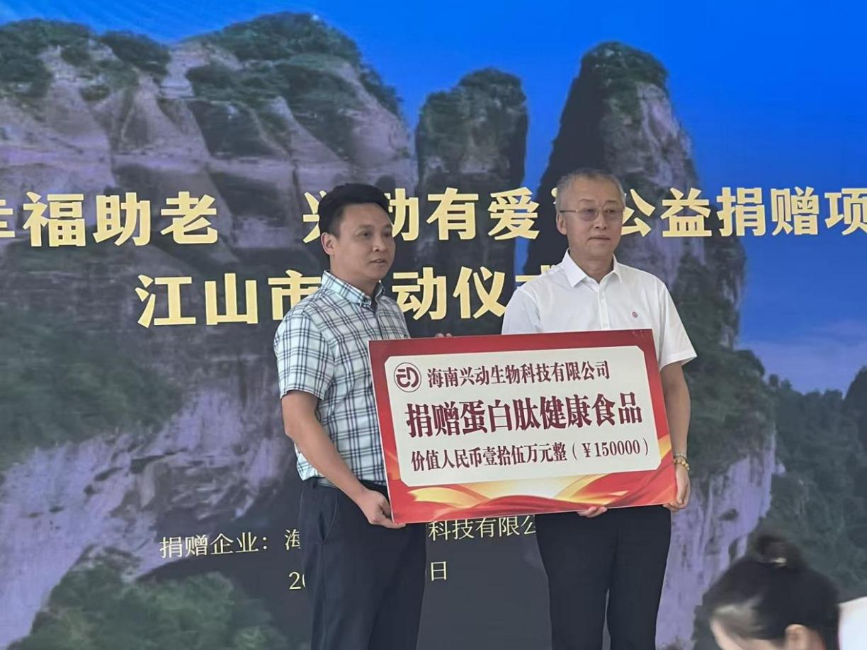 海南兴动生物科技有限公司积极履行社会责任,向“幸福助老 兴动有爱”公益活动捐赠价值1000万元产品。此次海南兴动率先为江山市石门镇捐赠价值15万元的蛋白肽健康产品。海南兴动董事长宁浩在仪式上表示,积极应对人口老龄化、支持养老事业,是企业义不容辞的社会责任。海南兴动将依托生物科技研发优势,持续深耕中老年健康领域,提供更加安全、有效的健康产品与服务解决方案,真正为老百姓做实事、办好事。