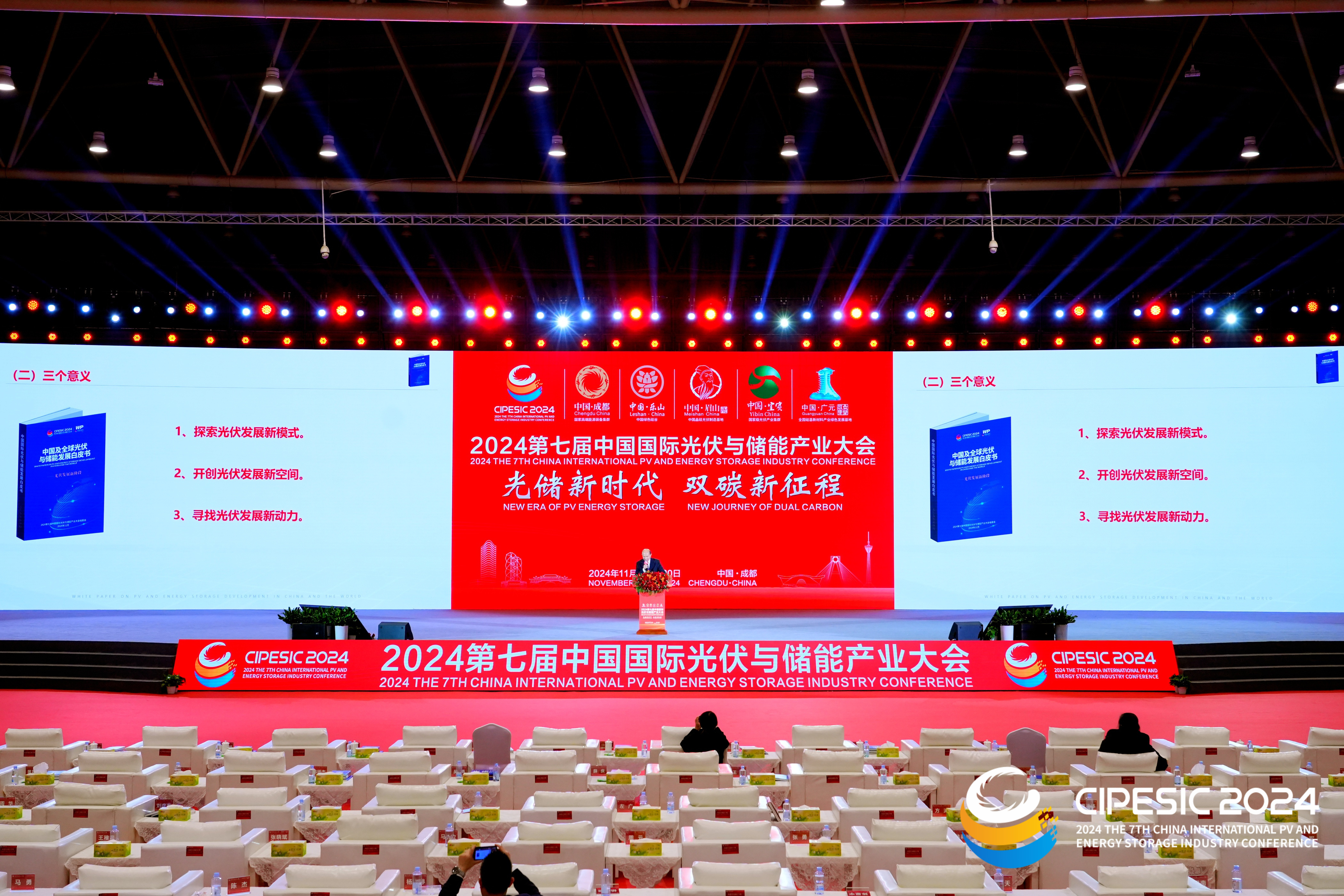 当日,2024第七届中国国际光伏与储能产业大会在成都举行。大会以“光储新时代、双碳新征程”为主题,地方政府代表、光储行业专家学者、领军企业家、光储企业代表齐聚一堂,共谋“双碳”战略新趋势,共议绿色低碳新前景。