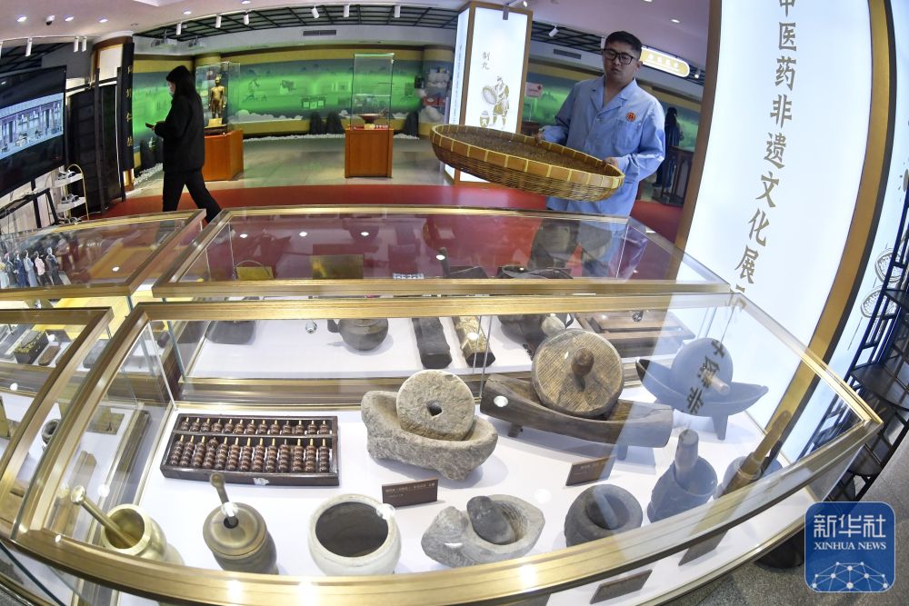 ↑ 11月13日拍摄的同仁堂大栅栏药店非遗展示空间内的传统制药文物展区。