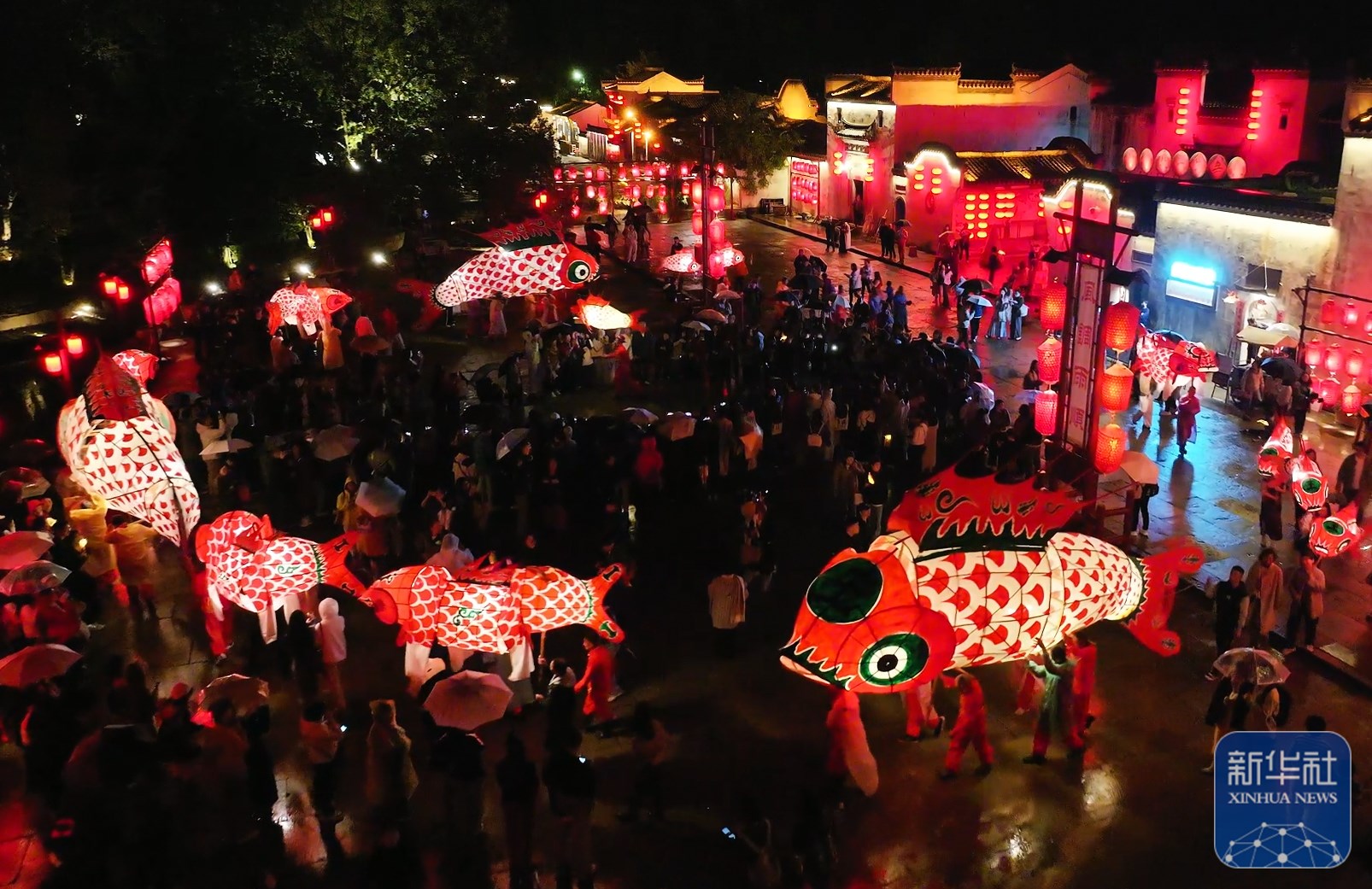 ↑ 11月9日,鱼灯表演队伍在黄山市徽州区呈坎古村巡游(无人机照片)。