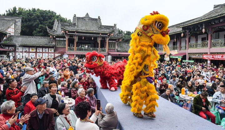 10月28日,在四川省成都市双流区黄龙溪镇,演员为参加“长寿坝坝宴”的老人表演舞狮,迎接重阳节。新华社发(李向雨摄)