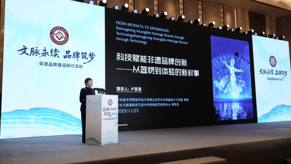 中央美术学院城市设计学院公共艺术与体验设计工作室导师卢英英作《科技赋能非遗品牌创新》主题演讲(2025年11月23日摄)。