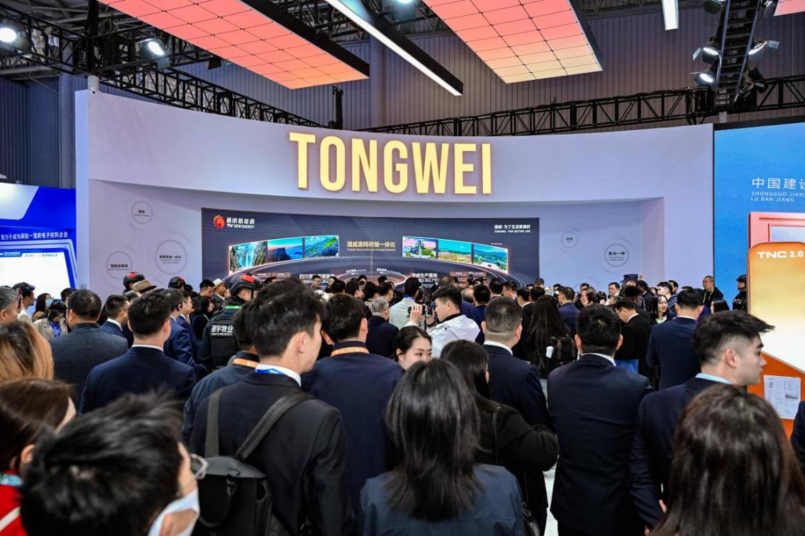 5000余家企业在现场搭建起一条完整的绿色能源产业链。超6万平方米展览,吸引了通威股份、阳光电源、华为数字能源等企业,覆盖光伏产业链、储能系统、核心零部件、运维服务、终端应用等新能源产业细分领域。