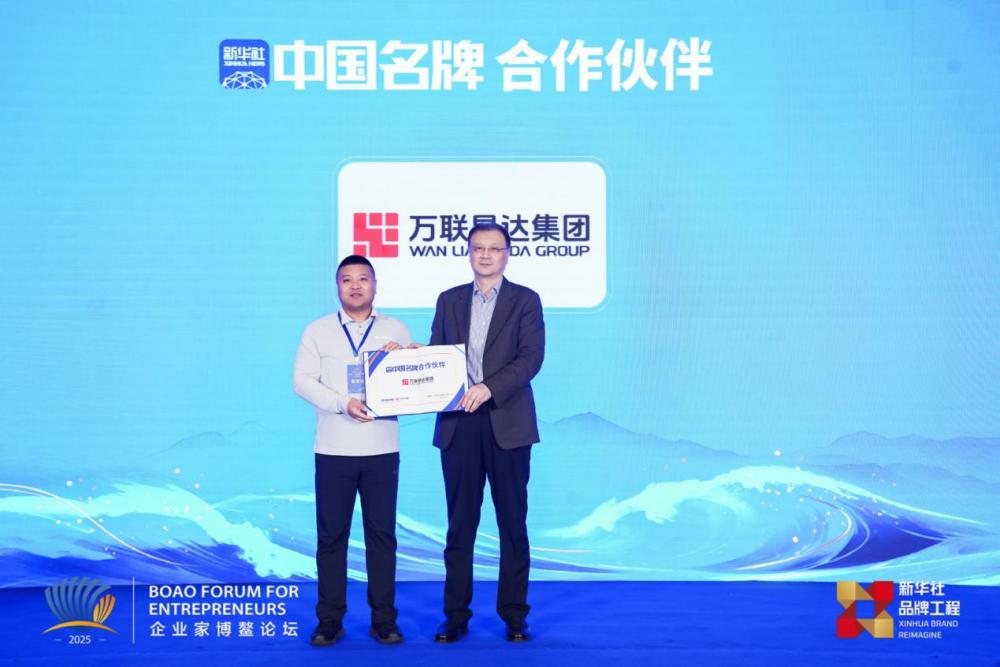 中国广告联合有限责任公司党委书记、总裁,《中国名牌》杂志社社长苏会志(右)为新华社“中国名牌”专项服务合作伙伴万联易达集团授牌